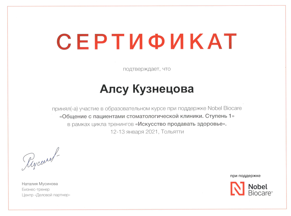 Алсу Шавкатовна работает в нашей клинике с 2010 года и является неотъемлемой частью команды. Она окончила Тольяттинское медицинское училище, получила дополнительные квалификации в области гигиены и сестринского дела, а также прошла обучение по работе с автоклавом и оборудованием, функционирующим под давлением. Благодаря глубоким знаниям и пониманию процессов в стоматологии, Алсу Шавкатовна помогает врачу обеспечивать точность, безопасность и высокие стандарты лечения.