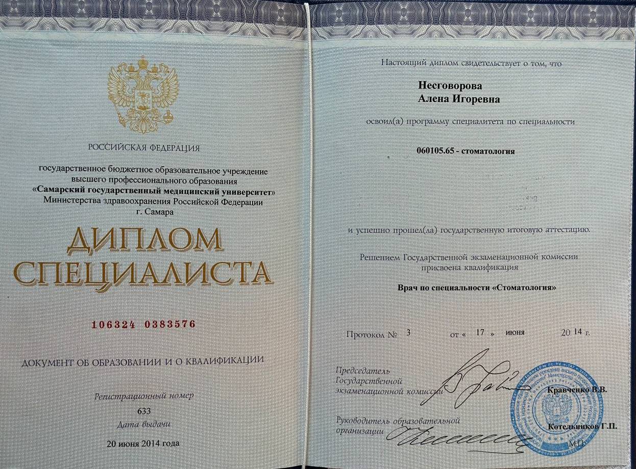 Алёна Игоревна окончила Самарский государственный медицинский университет, затем прошла интернатуру в Медицинском университете «Реавиз» по специальности «Стоматология общей практики». В 2020 году она прошла повышение квалификации в Самарском государственном медицинском университете, постоянно совершенствуя свои знания и навыки. Её профессионализм основан на точности диагностики, внимательности к деталям и применении современных методик лечения.