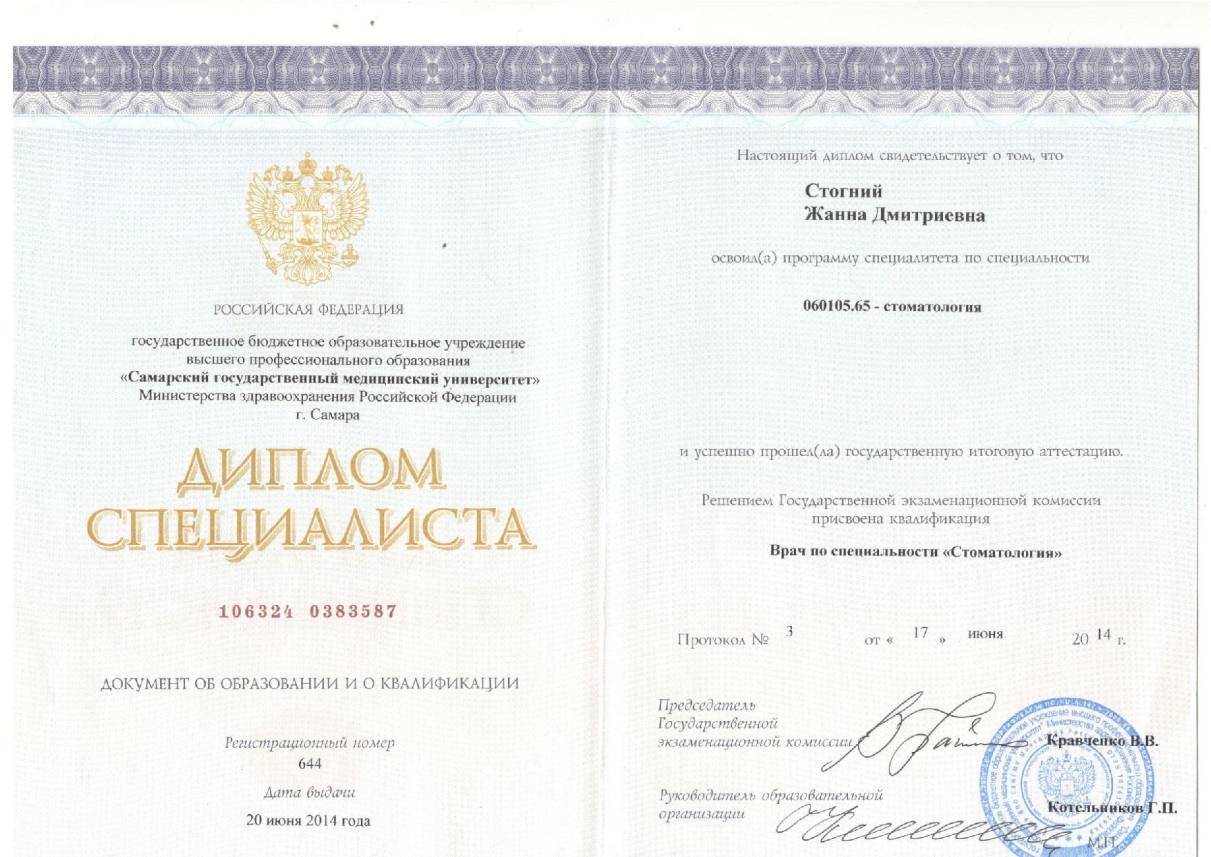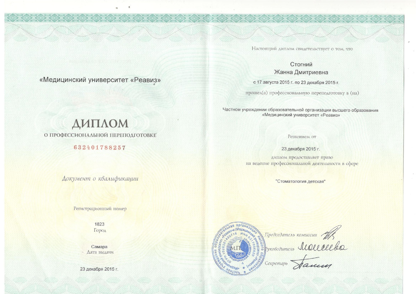 Жанна Дмитриевна получила базовое образование в Самарском государственном медицинском университете и прошла интернатуру по стоматологии общей практики. Далее она специализировалась на детской стоматологии, проходя циклы переподготовки в Медицинском университете «Реавиз» и повышение квалификации в Самарском государственном медицинском университете. Регулярное обучение позволяет ей применять современные методы лечения и профилактики зубов у детей любого возраста.