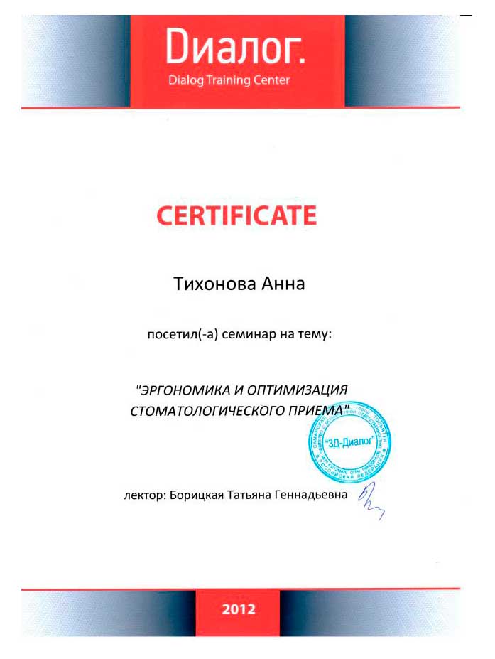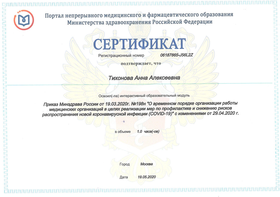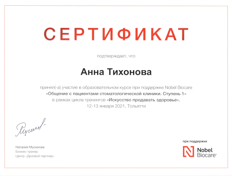 Тихонова Анна Алексеевна — опытный ассистент врача-стоматолога, работающая в клинике с 2016 года. Имеет медицинское образование по специальности «Лечебное дело» и дополнительную квалификацию в области сестринского дела в стоматологии. Прошла обучение по оказанию неотложной помощи в амбулаторных условиях, что позволяет ей уверенно действовать даже в нестандартных ситуациях. Анна Алексеевна отлично владеет методами стерильной обработки инструментов и обеспечивает безупречный порядок в кабинете.