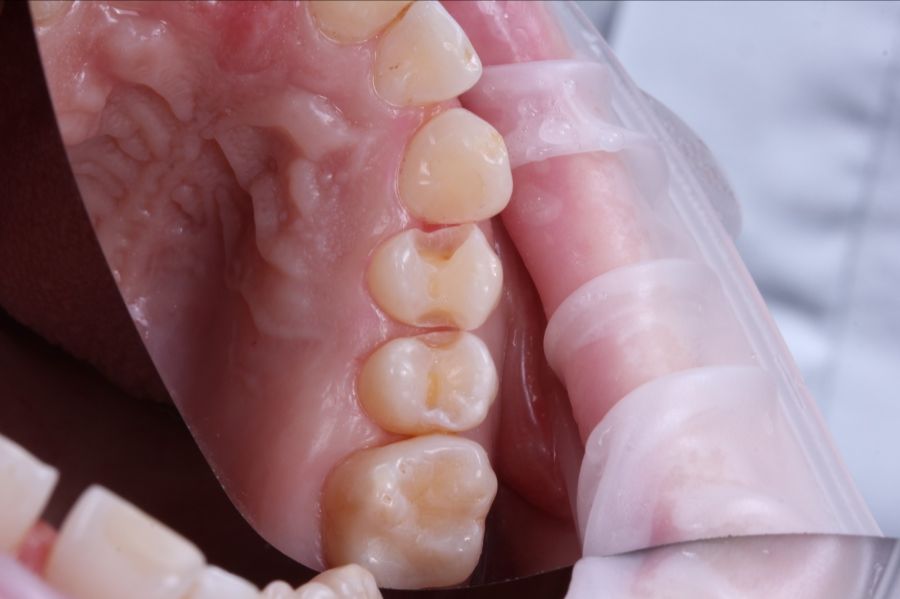 Под местной анестезией провели обработку кариозной полости, установили матричную систему Palodent и выполнили реставрацию зуба материалом GRADIA DIRECT POSTERIOR РА2, провели окклюзионный контроль.